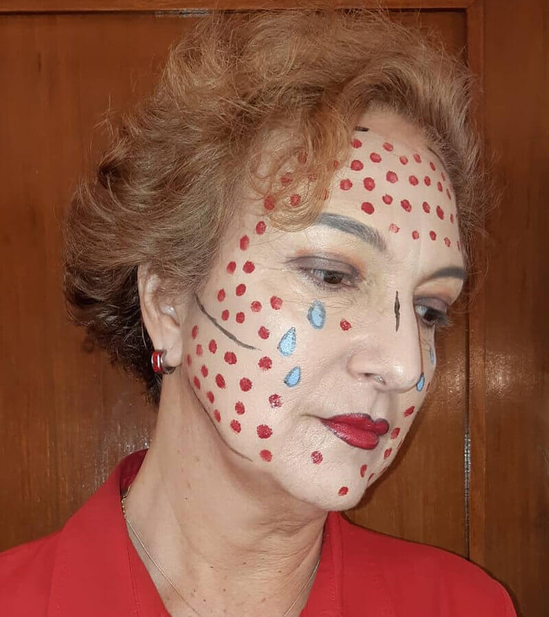 Maquillaje aplicado al rostro, con extensión de piel, maquillaje de personajes. Se puede agregar plumas o cristales. Ideal para obras de teatro, fiestas de disfraces o publicidad.
